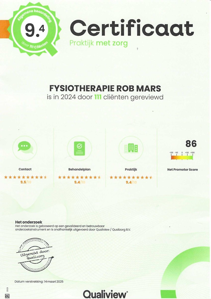Onlangs ontvingen wij het certificaat van Qualiview met de beoordeling van onze patiënten van de door onze behandelaars verleende fysiotherapeutische zorg in 2024. We zijn apetrots dat we door 111 cliënten beoordeeld zijn met een gemiddelde van 9,4.