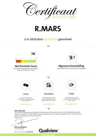 Een greep uit de reacties van klanten:Zorgkaart Nederland, gemiddelde waardering 9,6 uit 68 waarderingen:Zorgkaart Nederland (Fysiotherapie Rob Mars): 08-07-2024: 9,7: "Gaat goed: Fysiotherapeut luisterd goed naar mijn klachten, en begreep mijn onzekerheid. Vertelde wat hij ging doen en heeft een rustige benadering". 01-07-2024: 9,0: "Heldere uitleg en prima begeleiding". 19-06-2024: 8,6: Gaat goed: datn ik snel en goed geholpen ben"