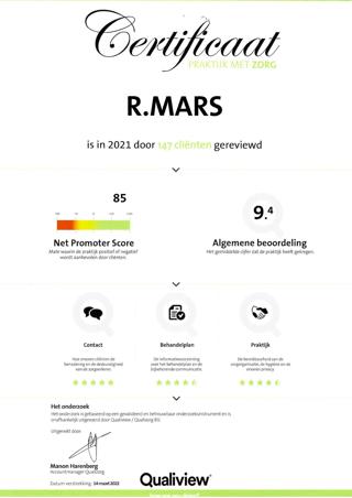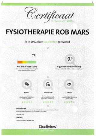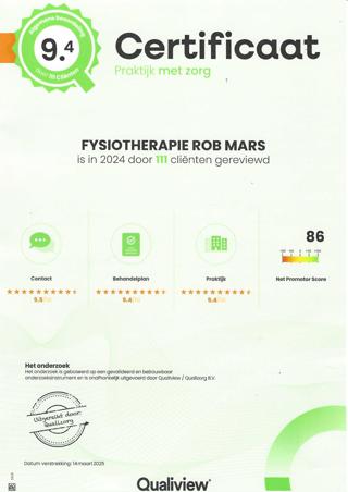 Qualiview certificaat 2024: 9,4!De kwaliteit van onze fysiotherapeutische zorg is voor ons zeer belangrijk. Hiervoor is uw de ervaring voor ons van essentieel belang! Om te meten hoe de patiënt de kwaliteit en zorgverlening binnen onze praktijk heeft ervaren, versturen we zelf enquêtes met het verzoek of u ons wilt beoordelen via Zorgkaart Nederland en Google. Voor diegenen die deelgenomen hebben aan de enquête: Onze oprechte dank voor de genomen moeite!